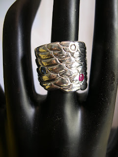 Here is a ring that I made for my friend Jenny. She saw a ring she really liked in a store, but it was really expensive. It was a plain silver ring in the shape of a wing that wrapped around the finger. She also saw other rings that had gemstones in it and wanted to see if I can add gemstones to the ring. So this is my version of the wing ring with multi color gemstones. It is hand carved from a piece of Precious Metal Clay(PMC) and the gemstones are lab created. Not very good pictures but it'll do. I think I can probably improve on a couple of things on the ring too. You know how it is. Whne you make something for the first time. You always end up thinking "oh, I should've did this instead of this." Anyways we'll see how Jenny likes it.